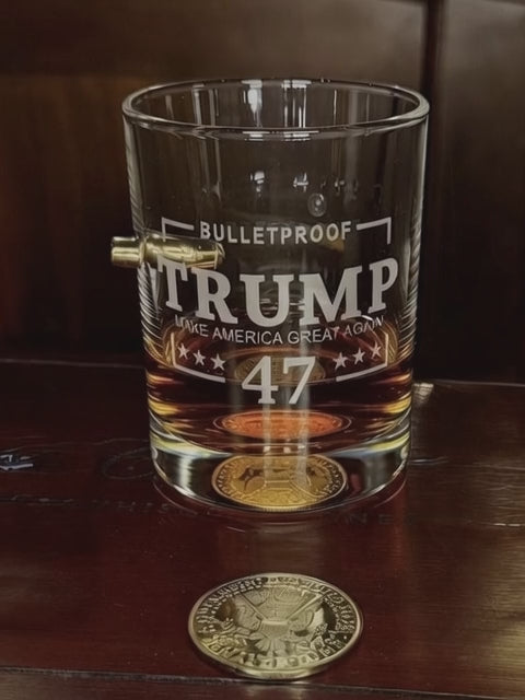 Whiskey Glass Set Gift Box - Trump Presidential "Bulletproof" 47 Laser Engraved, Memorabilia Coin Whiskey Glasses Set. Trump Bullet Whiskey Glasses set. Bulletproof Trump 47 Make America Great Again